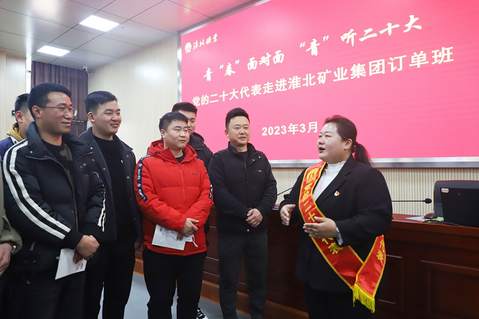 (2023年3月2日,黨的二十大代表劉婉春走進淮北礦業集團“訂單班”,面對面向訂單班學員宣講黨的二十大精神。)
