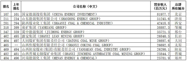 從中國上榜煤炭企業(yè)看,共有11家企業(yè)上榜,較上年凈增1家,山西焦煤集團(tuán)再次進(jìn)入500強(qiáng)名單。國家能源集團(tuán)、山東能源集團(tuán)、陜煤集團(tuán)繼續(xù)位列煤炭行業(yè)入圍企業(yè)三甲,兗礦集團(tuán)超過冀中能源集團(tuán)位列第四位,且其成為排名上升最快煤炭企業(yè)(上升81位)。11家企業(yè)中,國家能源集團(tuán),晉煤集團(tuán)位次略有下滑,其余企業(yè)排名位次均有所提升。