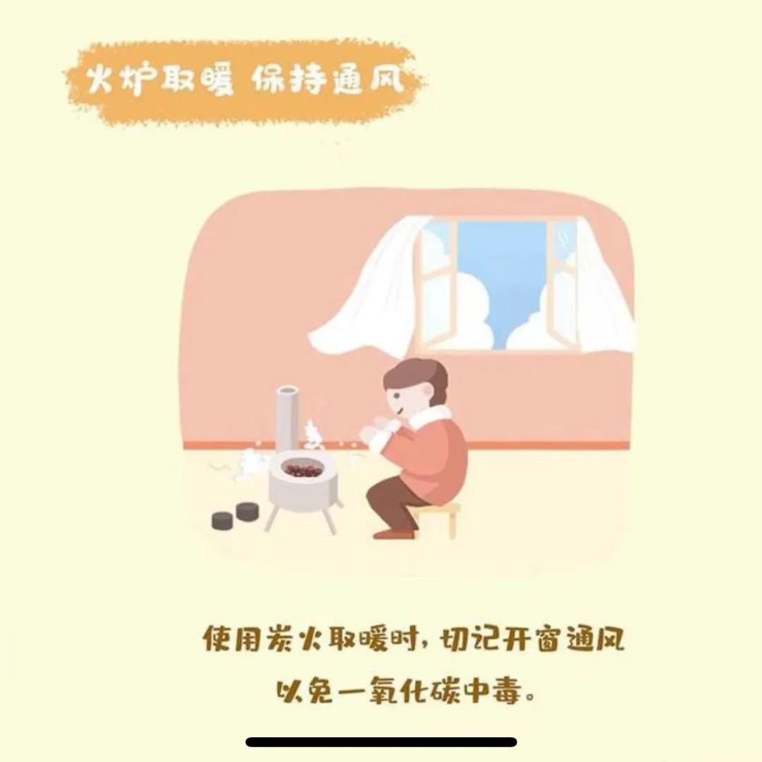 2.注意通風:室內使用煤爐、炭火等取暖設備時,煤炭要燒盡,不要悶蓋;門窗要預留一定的縫隙,保持室內空氣流通,避免一氧化碳聚積。